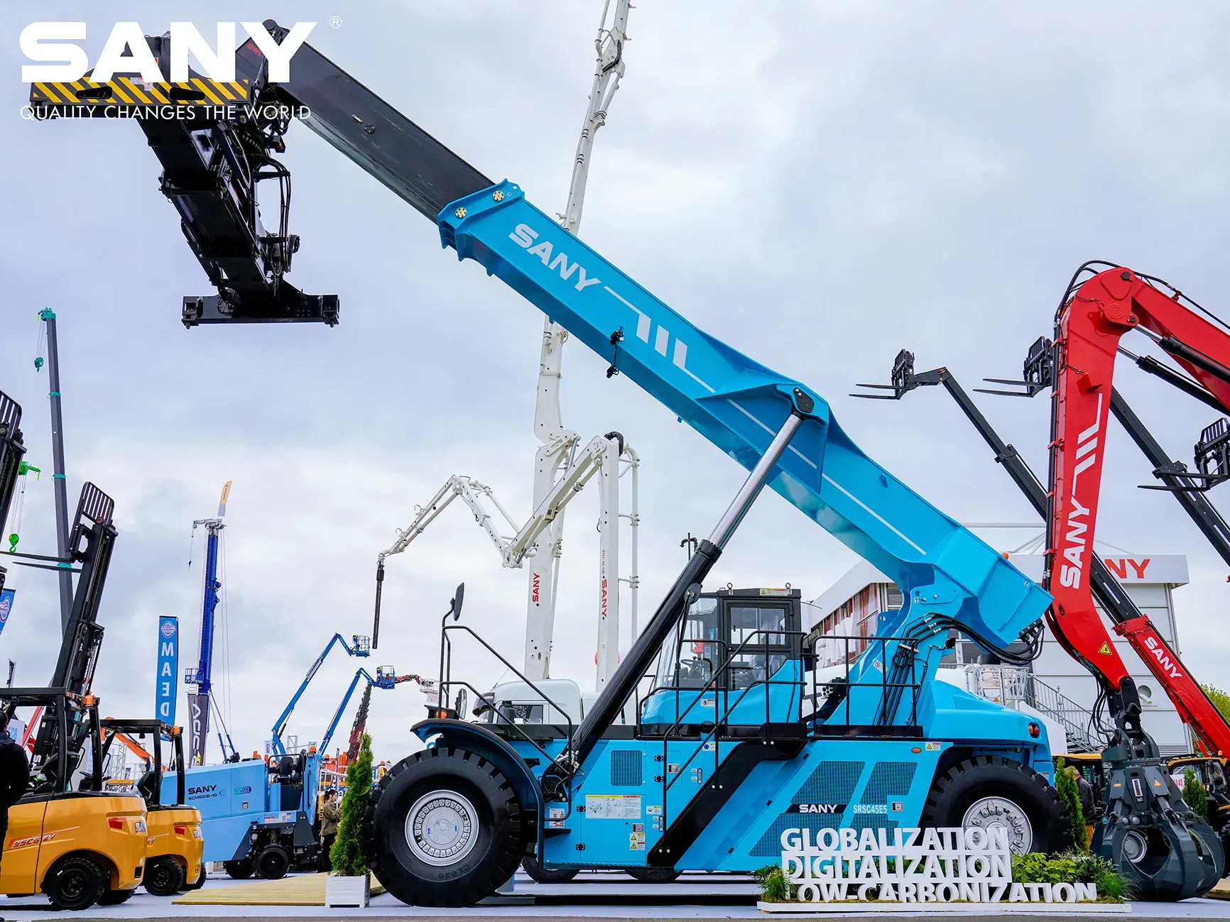 В соответствии с темой мероприятия этого года - «Низкий уровень выбросов углекислого газа» - мы организовали выставочную зону для электрооборудования, чтобы продемонстрировать 6 наших чисто электрических продуктов. Из них 5 были впервые представлены на европейском рынке, включая электрический ричстакер SRSC45E5, электрические вилочные погрузчики SCP25C6, SCP35C6, электронный миксер SY408C-8FRBEV и электрическую фрезерную машину SCM500E-10. Электрический мини-экскаватор SY19E выступил в роли «жизни вечеринки», играя в гольф с посетителями на площадке и предлагая покупателям качественный тест-драйв.