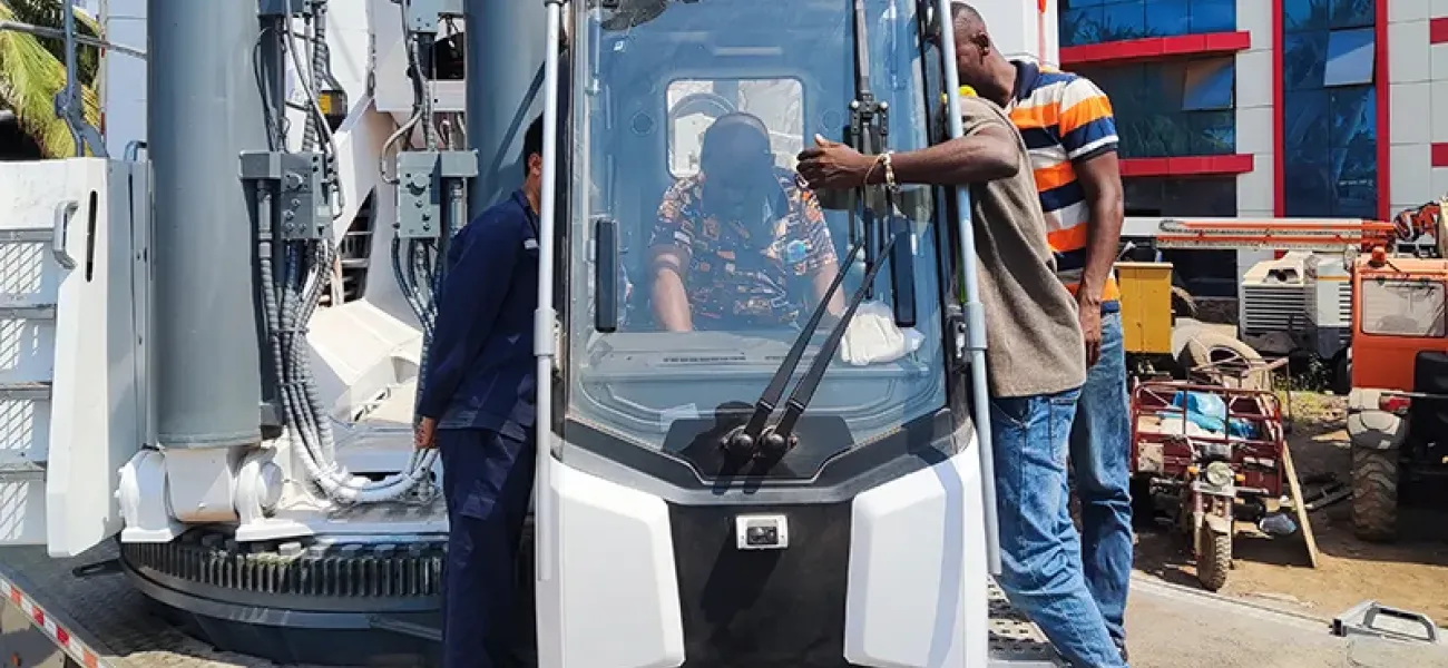 На огромном африканском континенте золотое солнце освещает совершенно новый 600-тонный вездеходный кран SANY, припаркованный на площадке для оборудования компании Sky Limit Structure Builders Ltd., крупнейшей компании по аренде подъемного оборудования в Гане. Здесь, среди сверкающей техники, выделяется знакомое лицо из SANY.
