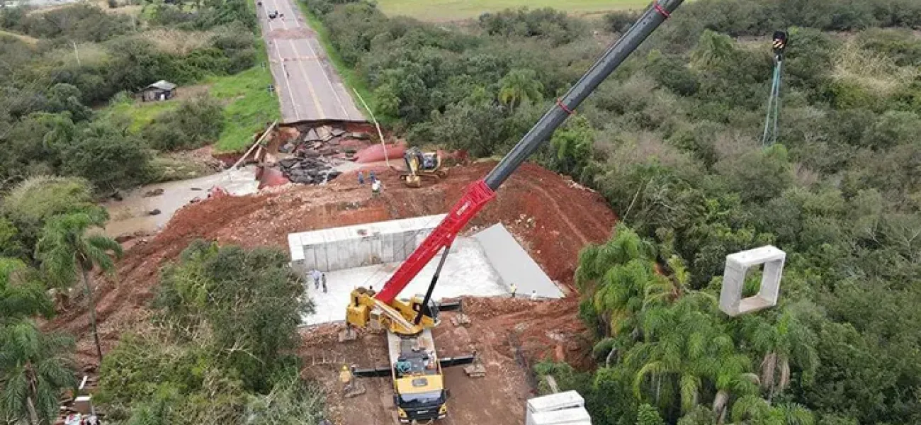 Национальный департамент транспортной инфраструктуры (DNIT) восстановил движение на 132-м километре BR-290/RS в Эльдорадо-ду-Сул в понедельник вечером (05/06) с помощью крана SANY STC900T5, что принесло небольшое облегчение и надежду для региона.